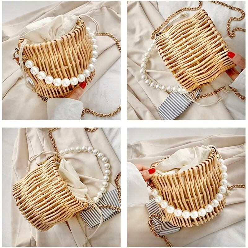 Summer bag 2way カゴ ハンド ショルダー バッグ サマー 藤 プール ショルダー 鞄 茶 編み レトロ 韓国 雑貨 ビーズ