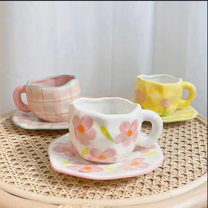 Flower Mug&saucer set フラワーマグカップ&ソーサーセット ブルー セラミック レトロ コップ お皿 紅茶 ガラス おうちカフェ